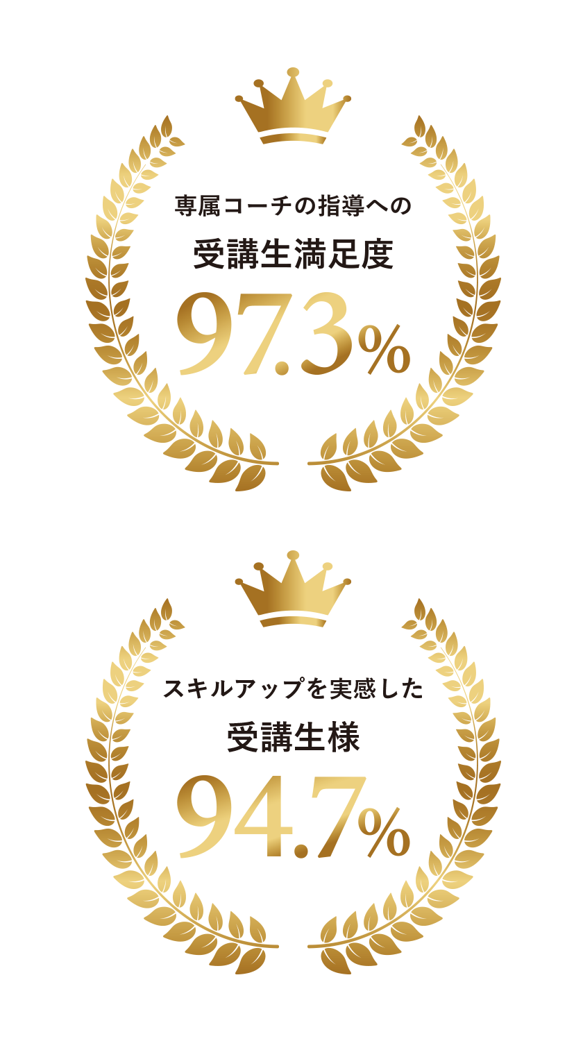 ※専属コーチ満足度 97.3% 受講生アンケート調査の結果 (受講生 113名/2023年12月1日 - 18日) ※スキルアップ実感率 94.7% 受講生アンケート調査の結果 (受講生 113名/2023年12月1日 - 18 日 )