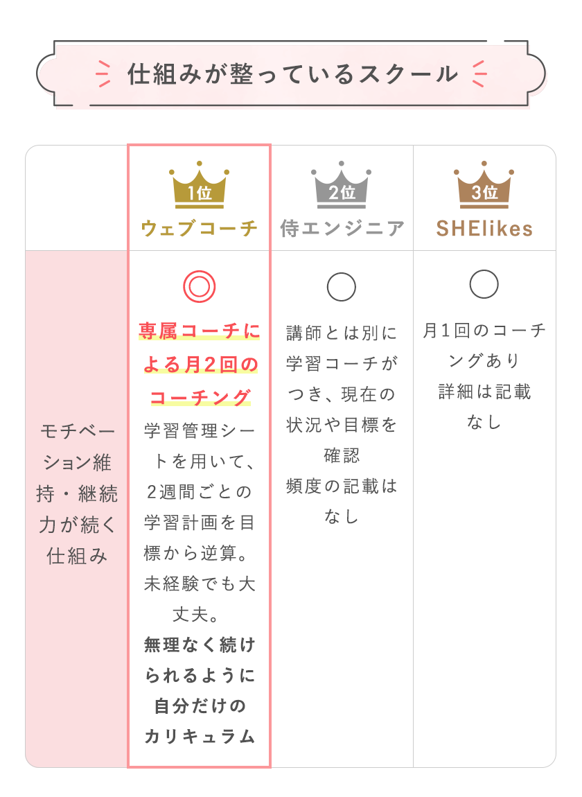 なかでも学習の進め方や悩みをサポートしてくれるコーチングがあるスクールが特におすすめです。